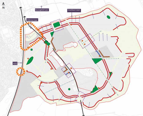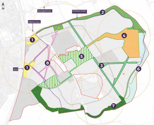 17. The creation of significant Green Infrastructure areas and buffers, particularly on the southern and northern boundaries to contribute to the creation of permanent defensible Green Belt boundaries between the development and Tollerton and Bassingfield. An enhanced Green corridor should also be created along the Grantham Canal; and
