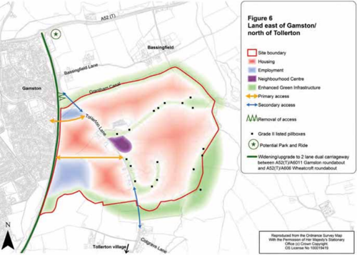 1.22. Policy 25 in the Local Plan Part 1 identifies land east of Gamston and north of Tollerton as a Strategic Allocation. The indicative distribution of the proposed uses within the site allocation boundary is identified on Figure 6 within the Local Plan Part 1, as shown in Figure 4.