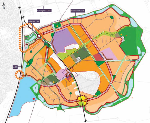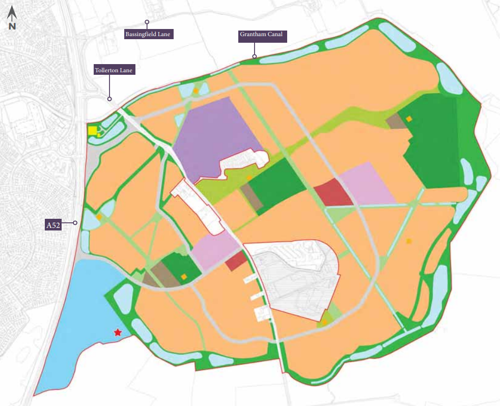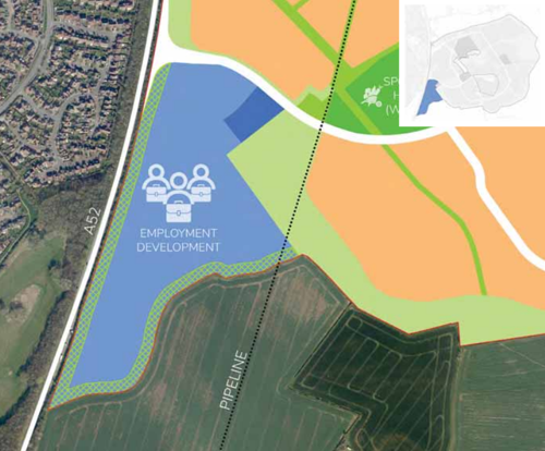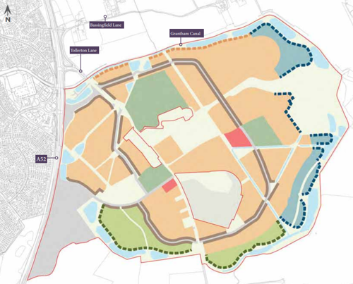 The area, as shown on the adopted Policies Map, is identified as a strategic site for the mixed use development including around 2,500 dwellings up to 2028, up to a further 1,500 homes post 2028, around 20 hectares of employment development, a neighbourhood centre and other community facilities as appropriate. The design and layout of the proposal will be determined through a masterplanning process. The final design, layout and quantum of development shall take full account of heritage assets and their setting. The development shall be appropriately phased to take into account provision of necessary infrastructure, including improvements to the highway along the A52(T) and public transport network. The distribution of the indicative proposed is identified on Figure 6 within the Local Plan Part 1, as shown in Figure 4. The development will be subject to the following requirements: