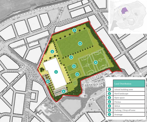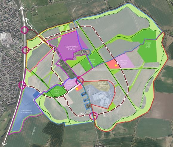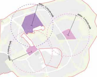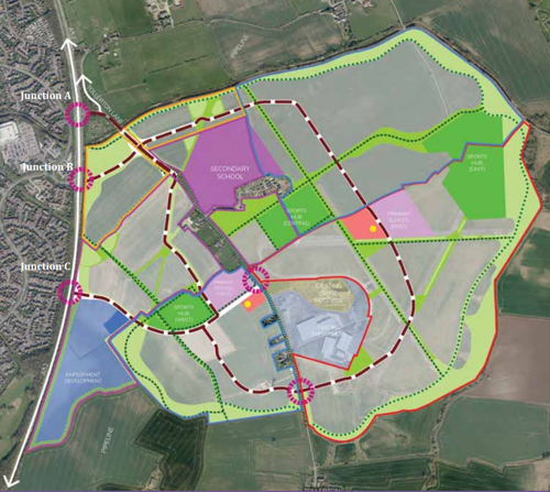 1.2. Given the multiple ownerships on-site, the allocation is likely to be developed through a number of planning applications coming forward at different times. This SPD sets out specific requirements of the local authority, the local highway authority, the local education authority and health providers to ensure those submitting applications are informed about the requirements from the outset. The locations of proposed infrastructure on Figure 41 show the preferred location of infrastructure to create a sustainable new neighbourhood, subject to any refinements required as a result of detailed work and additional evidence that emerges through the development management process.