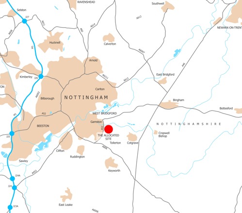 1.15. Tollerton village is located to the south but physically separated from the allocation site. Bassingfield is located to the north of the Grantham Canal, which is also physically separated from the allocation site. Gamston is located to the west of the A52(T).