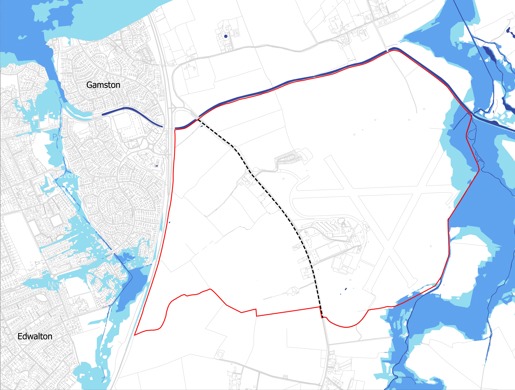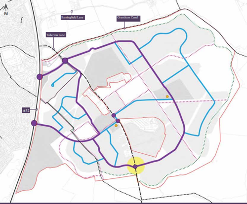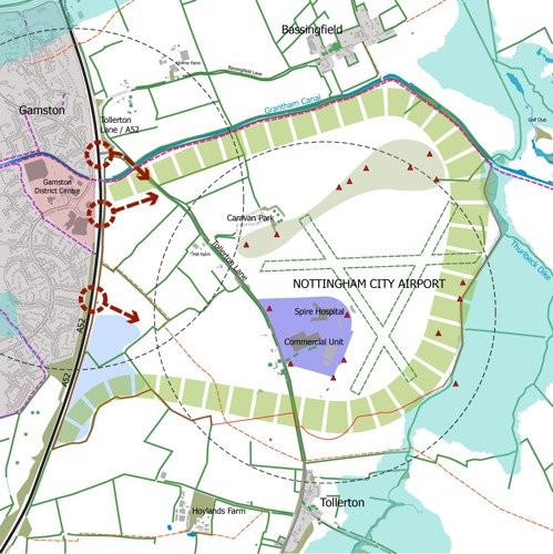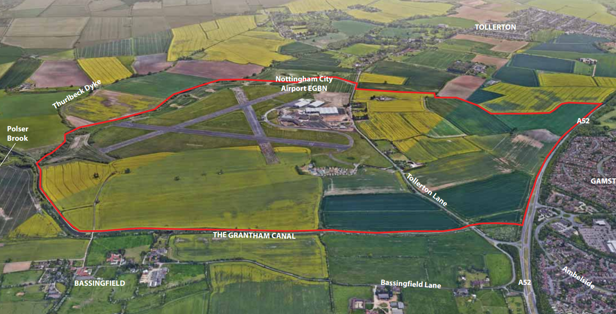 1.13. The area of land covered by the strategic site allocation comprises agricultural fields and most notably Nottingham Airport. The Grantham Canal is located to the north of the site, Polser Brook and Thurlbeck Dyke are to the east, with agricultural fields to the south and the A52(T) is to the west of the Allocation. Tollerton Lane runs through the site roughly in a north-south direction.
