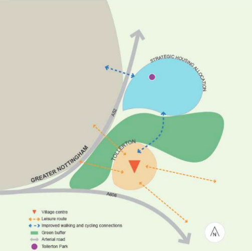 1.4.1 The aim of the spatial strategy is to show the vision for Tollerton parish in a visual way. All the policies work towards this strategy. Whilst Tollerton village and the Sustainable Urban Extension to the east of Gamston/north of Tollerton are within the same parish, the aim is to ensure that both function as self-sufficient settlements meeting the needs of existing and future residents. Key to this vision is that the two settlements will be separate but well connected, particularly by foot and bicycle. The existing green buffer between the two settlements will be maintained and enhanced.