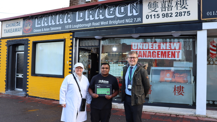 Members of RBC’s Environmental Health Team recently met with Shakeel Farhan and the Lanka Dragon team at their recently renovated Chinese takeaway on Loughborough Road in West Bridgford to congratulate them on achieving a 5-star hygiene rating.